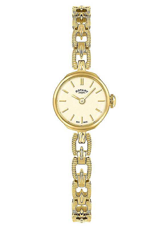 This Rotary 1895 draws from Rotary's rich catalogue of archive designs, reimagining a delicate ladies' watch with classic art-deco styling. The petite 19.5mm gold PVD case embraces a crisp white dial and gold hands. The dial is adorned with applied baton indices, ensuring clear legibility and visual balance. The highlight of the watch is the intricately designed, heavily jewellery inspired, link bracelet. Finished with subtle texturing and seamlessly secured with a hidden butterfly clasp. With water resistance up to 30m, this 1895 is a versatile accessory for everyday wear.30m Water ResistanceWhite DialStainless Steel | women's watch bracelet, small gold watch, metal watch bracelet, casual wrist watch, round watches, gold female watches, steel watch for ladies, ladies gold watch, watch bracelet link, classic female watches, ladies vintage watches, gold plated wrist watch, watches water resistant, butterfly clasp for watch, ladies analogue watch