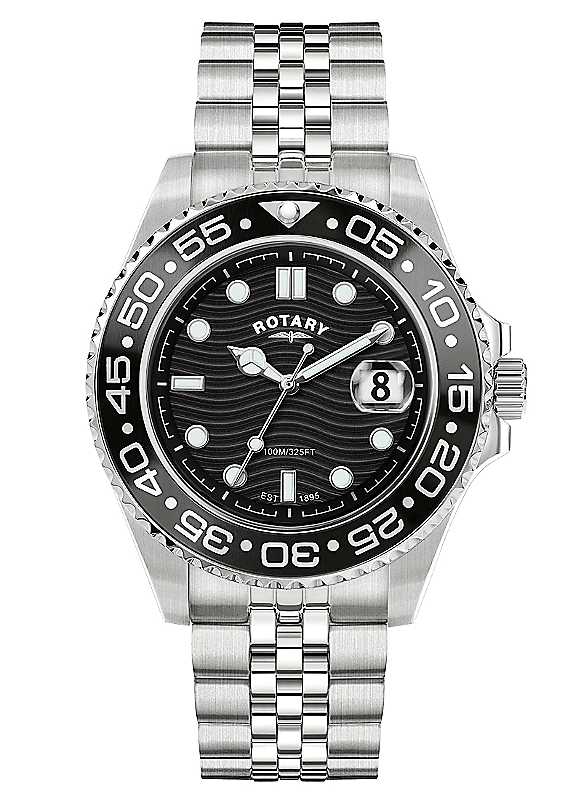 This Rotary APEX100 blends classic sports watch design with modern, robust watchmaking. From its bold unidirectional bezel and date magnifier to the subtle wave-textured black dial, it showcases hallmark elements of a true sports watch. Built for versatility, it features 100M water resistance, a screw-down crown, and sapphire glass - ready for everyday wear and weekend adventures alike. The sturdy 45mm stainless steel case and matching Jubilee bracelet deliver a refined, timeless aesthetic that pairs as effortlessly with a suit as it does with a wetsuit.100m Water ResistanceWave-textured black dialStainless Steel
