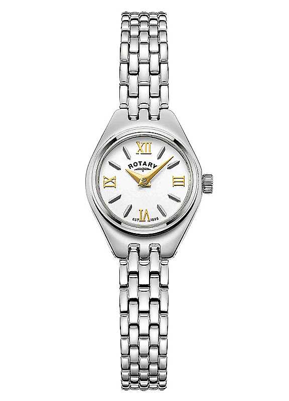 This Rotary Traditional ladies cocktail watch has a delicate case size of just 20mm. A stunning white dial with gold applied roman numerals and dauphine hands is encased by scratch resistant sapphire glass. A Stainless Steel 5 link bracelet is secured by a hidden butterfly clasp for a sleek look. This watch is water resistant up to 30m for everyday wearability.30m Water ResistanceWhite DialStainless Steel