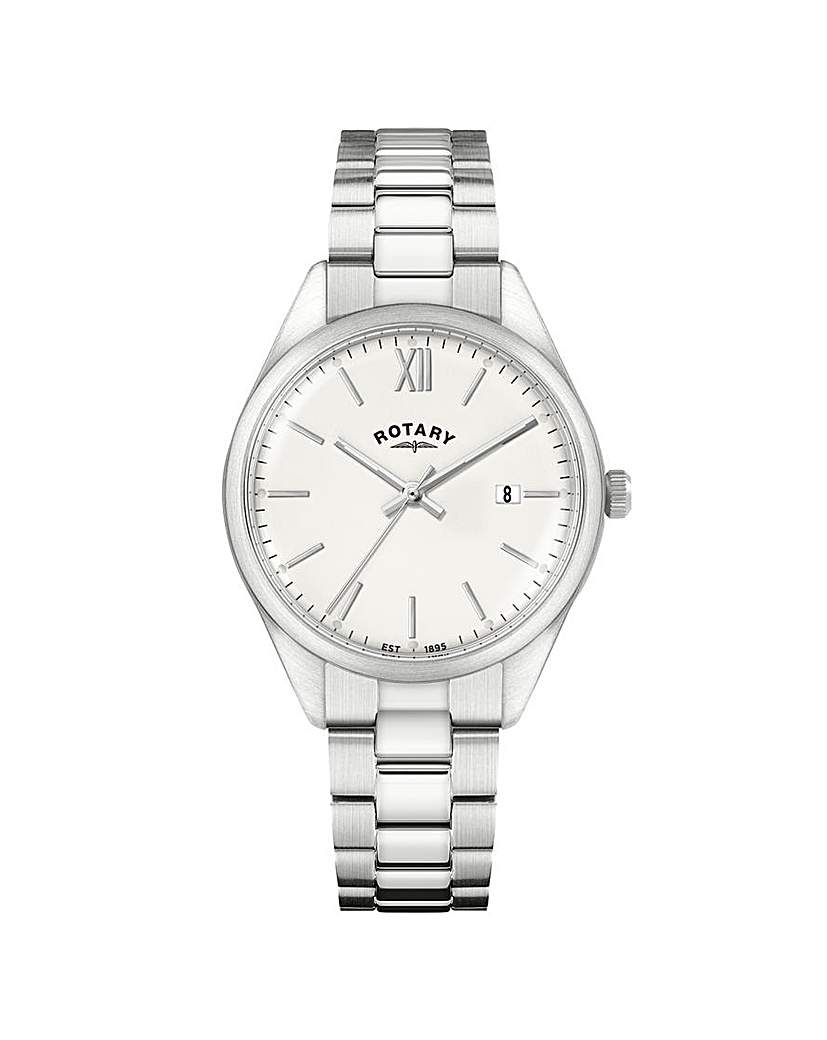 Rotary Men's Heritage Bracelet Watch This Rotary Heritage offers a versatile design that feels equally at home on the beach or in the boardroom. Its 39mm stainless steel case and 3-link 18mm bracelet perfectly frames the crisp white dial. With 50M of water resistance and a date window neatly positioned at 3 o'clock, balancing form with function. Attention to detail - from the interplay of brushed and polished links, to the domed mineral glass - ensures a truly premium watch-wearing experience. Heritage Presented in Official Rotary Packaging Dimensions: 21 x 4 x 1