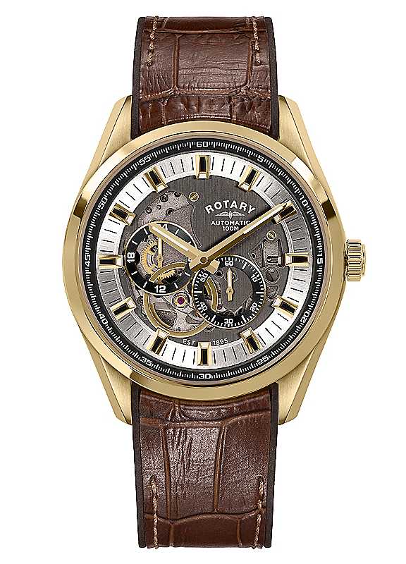 Unveil the inner workings of time with the striking Rotary Seamatic Eclipse. Framed in a bold gold-tone case, this watch features an intricately skeletonised dial that offers a window into the self-winding mechanical movement beneath. The inclusion of an exhibition case back allows for a glimpse into the back of the movement and the rotor. The multi-textured dial, complete with a small seconds sub dial and 24-hour indicator, combines functional complexity with classic dress watch appeal. Polished gold-tone markers and hands contrast beautifully against the partially open-worked dial, while the brown leather strap has an inner silicone lining, enhancing the wearability whilst maintaining vintage-inspired charm. Designed for the discerning watch enthusiast, this watch balances modern watchmaking with timeless style.Visible Self winding Mechanical MovementBrown Leather StrapStainless Steel | leather watch strap, stainless steel watch, 24 hour dial watch, round watch, skeleton watch, casual watch, automatic watch, gold plated watch, water resistant watch, analog watch