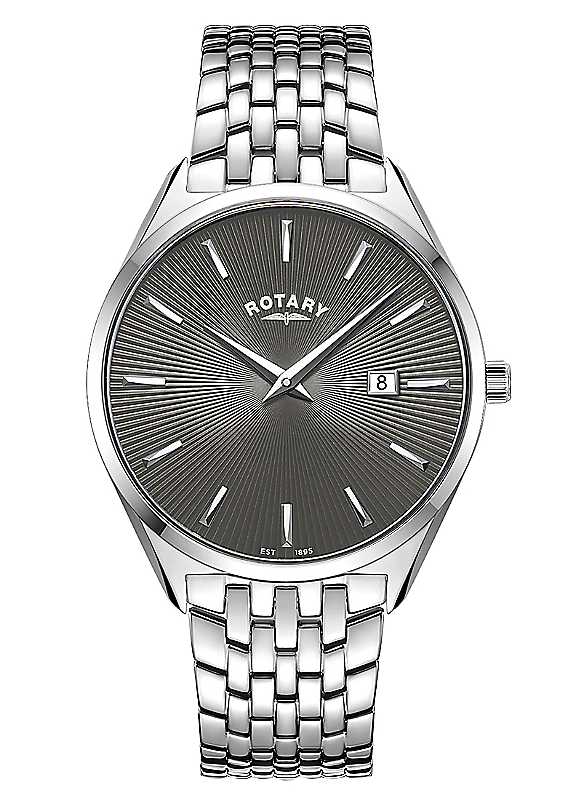 The Rotary Ultra Slim delivers a sleek highly-wearable 38mm stainless steel case that easily fits under a shirt cuff. At just 5.7mm thin, the Ultra Slim lives up to its name in delivering all day comfort. The 7-link stainless steel bracelet continues the elegance of the case curve, creating a unified feel to the watch. The lug-to-lug of 44mm gives a classic presence on the wrist. The grey guilloche dial beautifully compliments the stainless steel of the case and bracelet. Featuring stainless steel hands and baton indices for legibility and a date window at 3. With 50m of water resistance and sapphire glass, the Ultra Slim is robust and designed for daily wear.50m Water ResistanceSapphire GlassDate WindowStainless Steel
