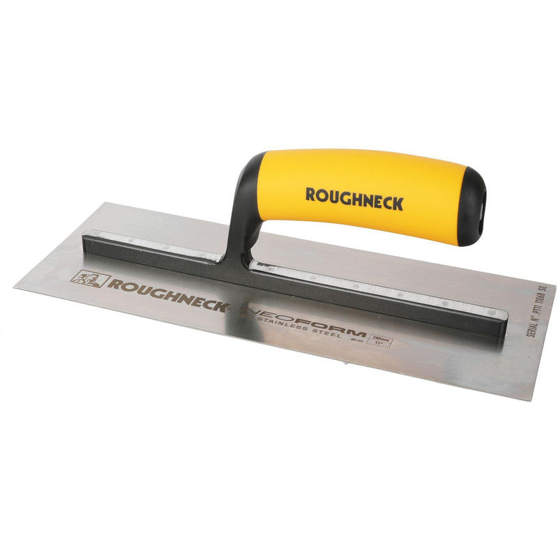 Premium?grade 301 stainless steel blade with low?drag glide for immaculate finishes. Durable soft?grip handle for secure handling and sustained comfort .Designed for tradespeople who demand consistant flawless results, the ROUGHNECK NEOFORM Plastering Trowel delivers exceptional performance straight from the first use. Crafted from premium?grade 301 stainless steel, the blade provides a highly responsive feel with an exceptionally smooth, low?drag glide ensuring immacualte finishes. The steel is hardened and tempered for long?term durability, delivering reliable performance even under heavy use. The trowel features a broken?in, concave blade with pre?worn edges, allowing for immediate, unblemished results by minimising line and ripple marks. A durable soft?grip handle offers secure handling and sustained comfort throughout extended periods of work. The handle is mounted on a lightweight, high?strength aluminium mount, fully riveted with industrial?grade rivets to deliver outstanding stability. A robust, responsive and ready?to?work trowel engineered for superior finishing performance. * Available in sizes – 121x356mm (14") and 114x280mm (11") * Premium 301 stainless steel – for durability * Broken-in blade – ready for use * Pre-worn edges – minimises marks * 0.7mm blade – precision thickness * Aluminium alloy mounting – lightweight strength * Soft grip – comfortable handling | Roughneck Professional Stainless Steel Plastering Trowel 11" in Yellow/Silver