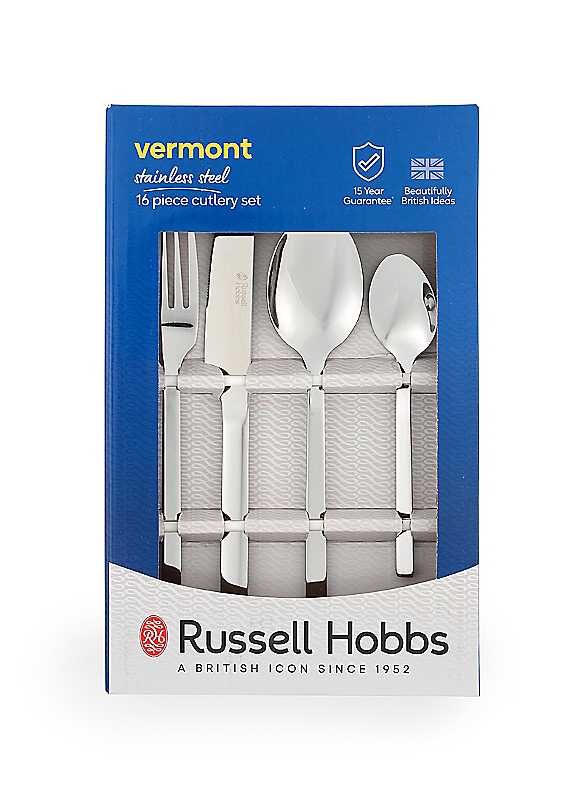 Introduce a luxurious look to your cutlery drawer with this stunning 16 Piece Vermont Cutlery Set by Russell Hobbs. Perfect for modernising your dinnerware or for new home owners, this set offers four knives, four forks, four tablespoons and for teaspoons, essential for everyday use. Designed with a mirror polished stainless steel and a delicate tapering handle design, this set is both stylish and practical, and is guaranteed to impress your guests.Age Suitability: 18+ YearsThis elegant, inspiring cutlery will look superb in any home & bring charm to your dinnerware, adding a sparkling touch to the tableCreated from high quality stainless steel, the Vermont cutlery set is durable, strong & designed to enhance your dining experienceGreat for when friends are over, the set contains four 18. 5cm forks, four 21cm knives, four 18. 5 tablespoons & four 13cm teaspoonsCrafted with elegant handles, this cutlery set is comfortable to hold & is conveniently dishwasher safe to maintain a glossy finishBoasting a timeless look, this stunning cutlery will match most tableware schemes & will continue to last as fashions change