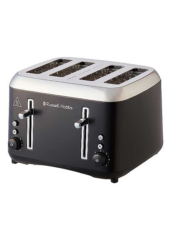 Craving perfectly toasted toast? The Russell Hobbs Addison Matte Black 4-Slice Toaster combines contemporary design with high quality features, providing all the modern functions you need in a toaster. This stylish toaster makes for a statement piece on any kitchen worktop, and with independent dual browning controls as well as defrost, reheat and cancel functions, it's got what it takes to toast the perfect slice. Featuring 4 slots and extra-wide openings, it's ideal for making toast, bagels, or crumpets for the whole family - mornings made easy!Split carriages for 2 or 4 slice toastingHigh lift function - easily remove your slices toastEasy access crumb traysExtra wide slotsDefrost functionIndependent browning controlReheat functionDimensions approx. H23 x W31 x D21 cm