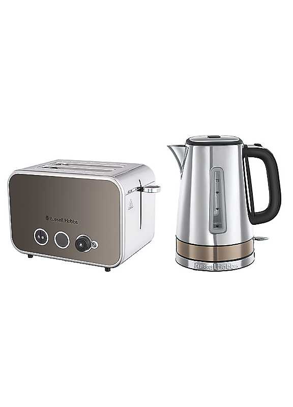 Russell Hobbs Distinctions Kettle and 2-Slice Toaster Bundle in Titanium.The Russell Hobbs® Distinctions Jug Kettle boasts an eye-catching combination of shiny straight sides and matt curvy accents. Quiet Boil technology helps you start your coffee break calmly, and the push-to-open lid and perfect-pour spout guarantee a smooth delivery from tap to cup. And it's just as easy to handle for right- and left-handers thanks to the fumble-free 360° base.Countertop style meets functionality in the distinctively designed Russell Hobbs Distinctions 2-slice toaster. With longer slots and a browning dial to achieve the perfect shade, it's a show-off-worthy addition to your breakfast collection.Kettle: Capacity approx. 1.7 Litre / 3000W / Quiet boil technology / Anti limescale filterToaster: 2 Slice / 1600W / Lift & look feature / Variable browning control / Removable crumb trayKettle: Dimensions approx. 23.8H x 22.4W x 20.2D cmToaster: Dimensions approx. 19.7H x 31.7W x 18.6D cm