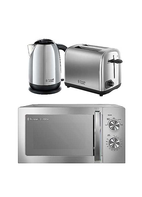 Russell Hobbs Polished Classics Bundle - Kettle, 2 Slice Toaster & Manual Microwave - Polished Steel
