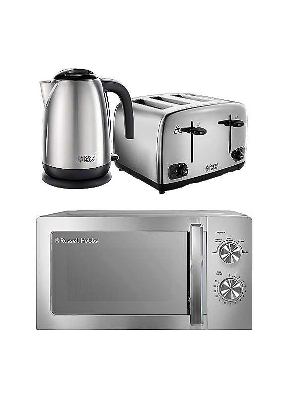 Russell Hobbs Polished Classics Bundle - Kettle, 4 Slice Toaster & Manual Microwave - Polished Steel