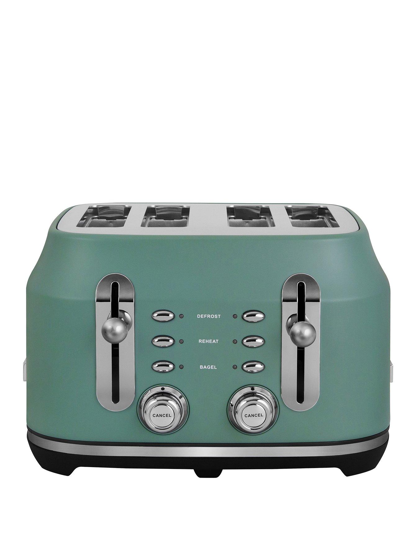 Russell Hobbs Rangemaster Rmcl4S304Mg Classic Toaster In Matt Mineral Green Meet The Classic 4 Slice Toaster, A Combination Of Timeless Tradition And Modern Innovation. Its Extra-Wide Slots Fit Everything From The Nation'S Favourite Bread To Thick Artisan Loaves And Delicate Crumpets, While The 6 Browning Levels Let You Enjoy Your Toast Exactly How You Like It - Whether That'S Lightly Toasted Or Beautifully Crisp. The Lift-And-Look Feature And Cancel Button Make It Easy To Monitor Your Toast Or Cancel Anytime, Helping You To Make The Perfect Slice. Plus, The 3 Auto-Settings Let You Defrost Bread, Reheat Toast Or Warm Bread, And Brown One Side Of A Bagel While Gently Warming The Other Side. Experience Safe Handling With Cool-Touch Sides And An Anti-Jam Function, Plus Easy Cleaning With The Removable Crumb Tray. Keep Your Kitchen Clutter-Free Thanks To The Integrated Cable Storage, Perfect For Countertops, Breakfast Bars, Pantries, Or Easy Storage When Tucked Away. Complete Your Kitchen With The Matching Classic Kettle To Elevate Your Breakfast Experience. Depth: 30.2 Cm Height: 19.8 Cm Width: 30.8 Cm Cool Touch: Y Removable Crumb Tray: Y Illumination: N Individual Slot Operation: N Non Slip Feet: Y Number Of Slices: 4 4 Extra-Wide Slots 6 Variable Browning Levels Lift-And-Look Feature Cancel Button Defrost, Reheat And Bagel Settings Cool-Touch Sides Anti-Jam Function Removable Crumb Tray Integrated Cable Storage Matching Classic Kettle Available