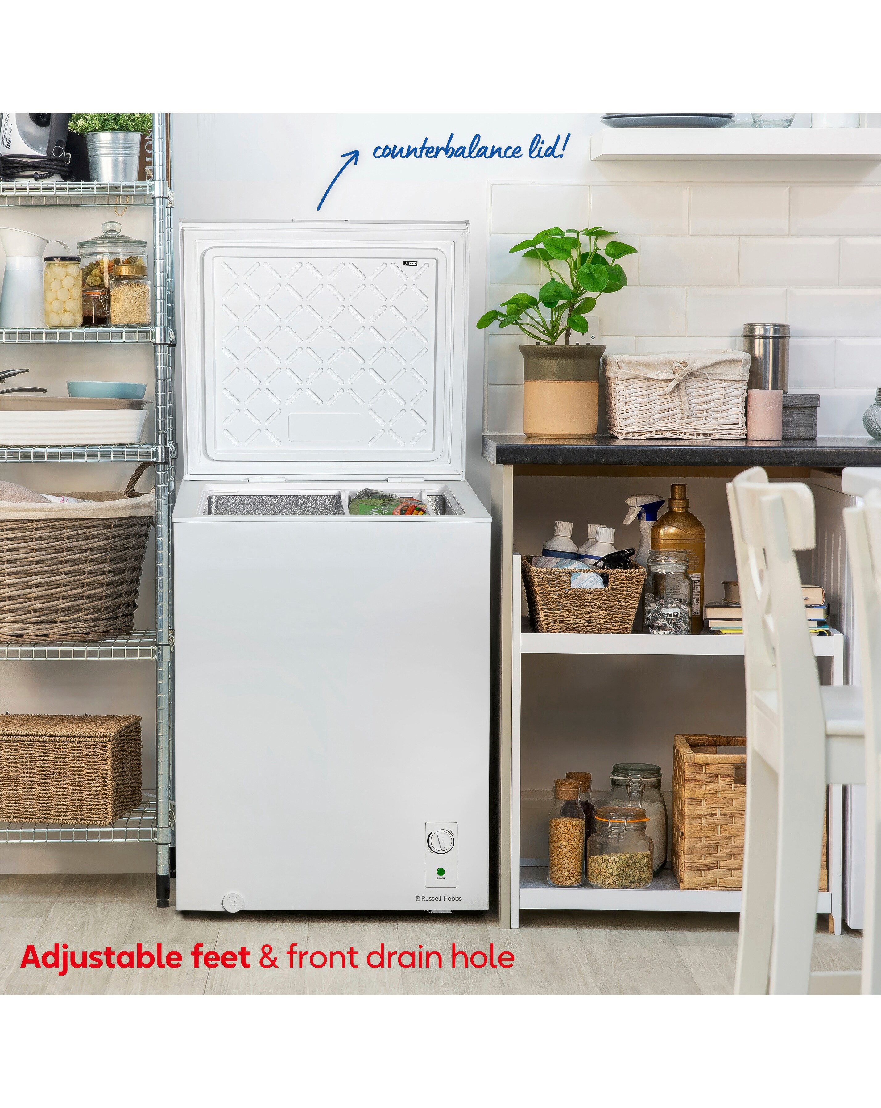 Organise your frozen food with ease with this Russell Hobbs Chest Freezer. Built to accommodate up to 7 shopping bags and an impressive 143L of food, you can say goodbye to juggling food around trying to create space that is not there, and hello to spacious and effective freezing. Boasting a generous 143L of storage space, this freezer accommodates the equivalent of up to 7 bags of shopping, meaning plenty of room for big food shops and leftovers! Making it super convenient for batch-cooking, this freezer gives you the option to cook family-sized recipes and have plenty of room to store them. Perfect for households with limited space, this chest freezer is suitable for storage in your garage, outbuilding or shed. Free up some much-needed room in your kitchen freezer with this spacious solution instead! Wherever you choose to keep your freezer, you can be reassured it wont be disturbing you with its minimal 41dB of noise. This chest freezer comes with an adjustable thermostat which can be precisely adjusted to suit the contents of your freezer. Plus, there are adjustable feet to ensure your freezer is stable on uneven surfaces. This model also features a counterbalance lid, which means you can rummage without risking your fingers - once opened fully, the lid holds itself up. 143L Capacity (up to 7 bags of shopping), 4 Star Freezer Rating, Suitable For Garages And Outbuildings, Counter Balance Lid, Adjustable Feet, Removable Wire Rack, Front Located Drain Hole For Easy Defrosting, Energy Efficiency Performance Rating: E, 1.5M Power Cord, Up To 5 Years Guarantee