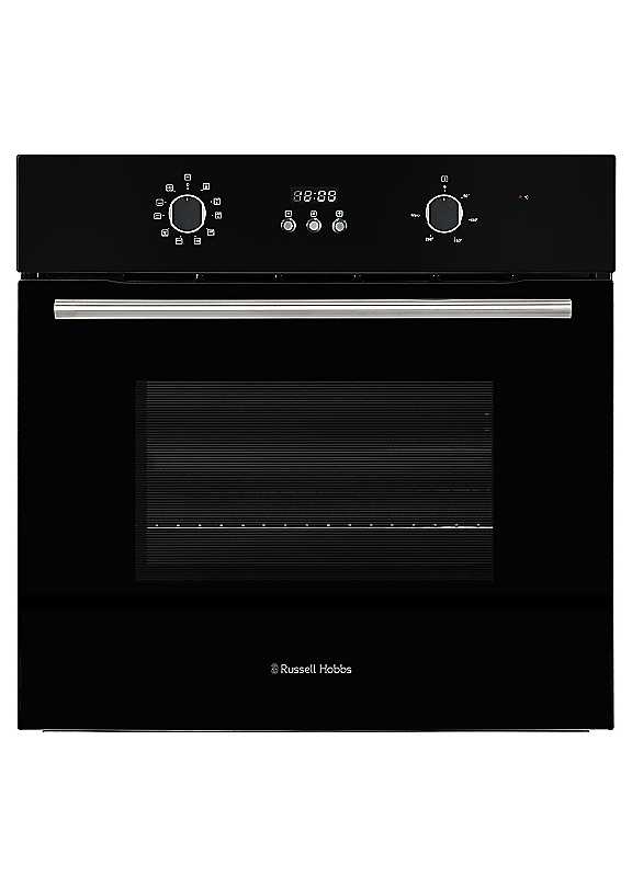This Russell Hobbs Built In Multifunctional Electric Fan Oven is a stylish addition to any kitchen; its sleek design seamlessly blends with any kitchen decor. With a single spacious cavity boasting an impressive 70L capacity and 10 oven functions, this oven is ideal for fulfilling all your family's cooking requirements.This oven provides complete flexibility with a range of cooking options, including convection heating, eco mode, grill with fan, grill only, and a defrost function. The convenient eco mode saves energy by evenly distributing heated air around the food using the top and rear heating elements.Equipped with two shelves, you can effortlessly prepare multiple dishes simultaneously. The user-friendly dials and button controls ensure ease of use whilst the digital timer and LED light enable you to maintain control over your cooking without having to open the oven door. Even better, the interior's easy-clean feature ensures that your oven stays looking newer for longer.For added peace of mind, this Russell Hobbs Oven comes with a 1-year guarantee with a free second year guarantee upon registration.This Built-in electric fan oven is perfect for all your family cooking needs. With 10 oven functions and a 70L capacity, it's effortless to cook a variety of meals.EASY CLEAN INTERIOR:This built in oven saves you valuable time and effort with its easy clean interior that eliminates the need for tedious scrubbing.10 OVEN FUNCTIONS:Choose from various heating options including: convection, eco, fan grill, grill, and defrost. Energy-saving eco mode circulates heated air using the top and rear elements.EASY TO USE:Dual shelves allow easy cooking of multiple meals whilst the user-friendly dials, timer and oven light enable convenient monitoring without having to keep opening the door.Single electric fan-assisted ovenPower: 3000 wattsEnergy efficiency rating: AEnergy consumption - Main 0.95kWh / Second 0.71kWh10 Oven functionsOven capacity: 70LEasy clean interiorDouble glazed doorOven light & timerDial & button controls2 x wire shelf1 x tray & handle1 wire rackWeight: 31.04kgPower cord: 1mProduct dimensions approx. 59.5H x 59.5W x 57.5D cmPlease Note: This product requires professional installation to a dedicated circuit by a qualified installer. | single oven black, black integrated ovens, black double ovens, black fan oven, integrated double oven black