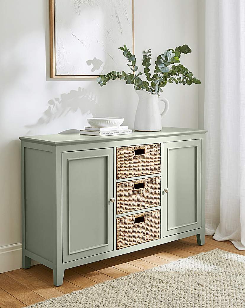 The Julipa Knighton Large Sidebaord Consists of 3 paperloom baskets and two internal shelves.