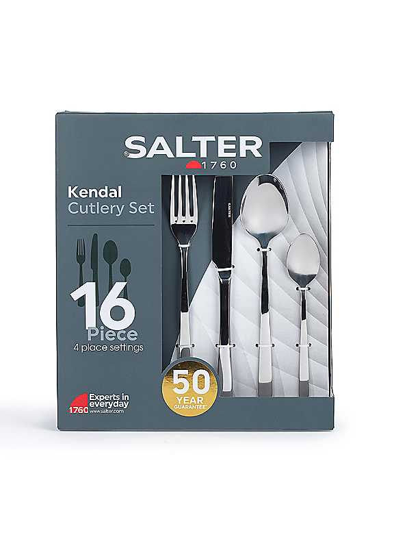 Dine in style with this Salter Kendal cutlery set! This 16-piece collection is crafted from durable 18/10 stainless steel, designed to be lightweight and comfortable to hold. The set includes everything you need for four place settings: forks, knives, dessert spoons, and teaspoons. Each piece boasts a stunning mirror polish finish and is dishwasher safe for an easy clean up! With a fantastic 25-year guarantee, this flatware is just as reliable as it is beautiful!Age Suitability: 18+ Years16 PIECE SET: Add the finishing touch to your table & enjoy every meal with Kendal! This set includes 4 x forks, 4 x knives, 4 x dessert spoons & 4 x teaspoons. Perfect for everyday & fine dining!18/10 STAINLESS STEEL: Made from 18/10 stainless steel, this cutlery set has been carefully polished to a mirror finish. Although it is dishwasher safe, we recommend you handwash in warm soapy water to maintain the finish & dry thoroughly25-YEAR GUARANTEE: This set is perfect for hosting dinners & a welcome addition to any dining collection. Combining function, style & durability, this Kendal cutlery set has a 25-year guarantee, what's not to love?PERFECTLY BALANCED: This flatware cutlery set is stylish & simply sophisticated. Expertly balanced each piece has been designed to be lightweight & comfortable to holdPERFECT FOR GIFTING: This cutlery is presented in a gift box to make a special gift for a wedding or housewarming