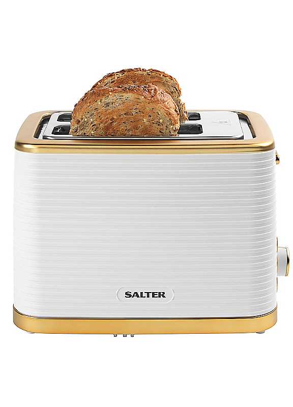 Start your morning off the right way with a perfect slice of toast from this 2-Slice Texture Toaster from the Salter Palermo collection. With 7 levels of variable browning, removable crumb tray and wide toasting slots, you can make perfect toast, bagels and crumpets every time with little mess. Boasting convenient defrost, reheat and cancel functions, this stylish toaster is suitable for everyday usage and the sleek white and gold textured finish looks great in any kitchen decor. Brand: Salter 7 Levels of variable browning Removable crumb tray & wide toasting slots Convenient defrost, reheat & cancel functions