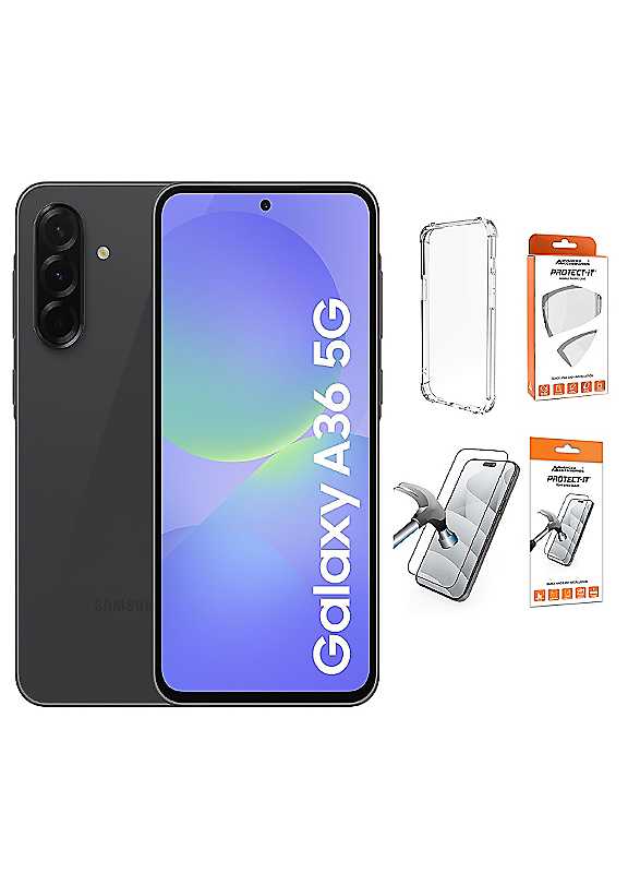 The Samsung Galaxy A36 is packed full of cool tech. With a 6.7ins Full HD+ Super AMOLED display, you can enjoy vivid colours and dazzling brightness. The 120 Hz refresh rate keeps everything super snappy, from scrolling through your socials to playing your favourite games. There's a triple camera system, with a 50 MP main lens, an 8 MP ultra-wide and a 5 MP macro. So from big moments to tiny details, it's got you covered. And the AI boosted Object Eraser lets you tap away unwanted photobombers and gives you helpful editing suggestions too.- Circle to Search with Google lets you to instantly search anything you see on your screen- Sunset doesn't mean the fun has to stop - Nightography lets you take clear pics and videos, even in the dark- The 5000 mAh battery keeps you going all day without reaching for the charger- Powering all your apps, games and tabs is the Snapdragon 6 Gen 3 processor- For insta-worthy selfies and clear video calls, there's a 12 MP selfie camera- It's got 256 GB of internal memory so there's plenty of room for your photos and apps- Forget about Wi-Fi passwords - 5G connectivity means fast internet wherever you go- Its IP67 rating means it's not afraid of a little dust or waterOperating system: Android 15Galaxy AI6.7ins Full HD+ Super AMOLED touchscreenTriple 50 MP/8 MP/5 MP main cameras13 MP front cameraBattery capacity: 5000 mAhSnapdragon 6 Gen 3 processorCharging port: USB Type-CWi-FiStorage: 256GBManufacturers guarantee: 2 YearsIncludes: Gel case & Screen protector, USB chargerDimensions approx. 164H x 77.5W x 7.7D mm