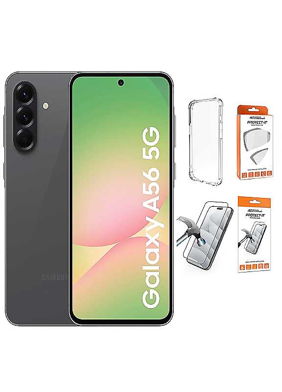 The Samsung Galaxy A56's got it all - three cameras, a sharp screen and performance for days. Its 50 MP triple camera setup can capture anything from vast landscapes to distant details. And with AI features like object eraser, you'll always get the perfect pic. For apps, games and movies, there's the full HD+ AMOLED display. It's got amazing colours and brightness, plus a 120 Hz refresh rate that brings every scene to life. And it's all fuelled by a 5000 mAh battery that will keep you going all day long.- The Exynos 1580 processor will easily power through any app or game- Splashes or rain showers don't need to worry you A56 has an IP67 water-resistant rating- sunset doesn't mean the fun has to stop - Nightography lets you take clear pics and videos, even in the dark- The best face camera feature lets you pick from 4 different frames for every face in your photo- 5G connectivity lets you stream films and shows on-the-go - even when you're on the bus to work- The 12 MP front camera is perfect for selfies with your friends, and zoom calls with your family- Fingerprint scanning and facial recognition keep your personal files safe, secure and for your eyes onlyOperating system: Android 156.7ins Full HD+ Super AMOLED touchscreenTriple 50 MP/12 MP/5 MP main cameras12 MP front cameraBattery capacity: 5000 mAhExynos 1580 processorCharging port: USB Type-CWi-FiStorage: 256GBManufacturers guarantee: 2 YearsIncludes: Gel case & Screen protector, USB chargerDimensions approx. 162.2H x 77.5W x 7.4D mm