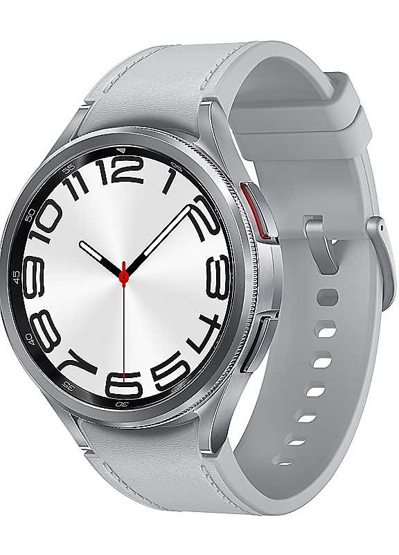 Samsung has developed the Galaxy Watch6 Classic to help people track and improve their everyday wellness. So everyone, not just athletes, have the tools and insights they need to find the right routine, the right balance, and continue to feel their best More screen. Thinner bezel Experience enhanced visuals and clear motion graphics on a 30% larger display. The 15% thinner bezel and increased screen size create an aesthetically perfect display-to-bezel ratio - and extra space for every tap and swipe. Sapphire Crystal glass. A clear difference in durability. Designed to withstand daily wear and tear. The display of Galaxy Watch6 Classic is expertly crafted with Sapphire Crystal glass to protect its timeless beauty. And the finishing has IP68 and 5ATM ratings, so you can keep your watch on through all your adventures. Go from boardroom to weight room in a snap. Swapping bands is as seamless as pressing the quick release button. A convenient guide lets you install the new band with ease - just press gently until you hear a click. Transition from work to workout or back again without breaking a sweat. More processing power to do more with every minute. Get more done in less time with Galaxy Watch6 Classic's upgraded processor. The 18% faster CPU speed and quick app launch time keep you productive and efficient throughout the day. Charge up in record time With one full charge, the watch lasts up to 40 hours. Fast charge the watch to 45% in just 30 minutes and you're all set to explore the great outdoors or enjoy a well-deserved break in bed. Hands-on shooting, hands-free. Pair your watch with Galaxy Z Fold5 to capture the healthy you up close or from a distance. Galaxy Z Fold5's Flex mode and Camera Controller let you easily switch between photo and video mode, or zoom in and out, all from the comfort of your wrist. Then tap the shutter button on your watch to take a pic. Samsung Wallet is always on hand. Access Samsung Wallet right from your Galaxy Watch6 Classic. Make payments, ride public transit, scan membership cards and more. You can even store non-payment items like digital IDs, tickets and keys, to lighten your load and empty out your pockets. Wake up to our most advanced sleep tracking. Get detailed sleep tracking with improved analysis and deeper insights to enhance the quality of your sleep. And now you can access Sleep Coaching on your Galaxy Watch6 Classic to build better sleeping habits. Get a good night's sleep when wearing your watch to bed by switching to the Fabric Band. Be sure to put your watch on sleep mode to change the PPG sensor's green LED to invisible infrared LED, dim the display brightness and mute notifications. Be prepared with Cycle Tracking. Get in tune with your health and body. Cycle Tracking powered by Natural Cycles - uses your nightly skin temperature from your watch, measured while you sleep, to predict the dates of your period and other cycles. Plan ahead and live life to the fullest with Galaxy Watch6. Brand: Samsung Battery life - up to 40 hours Charge time - up to 76 minutes Waterproof (IP68) Includes - Samsung Galaxy Watch6, wireless charging dock & quick start guide Manufacturer's guarantee - 2 years Dimensions - H42.5 x W42.5 x D10.9 mm