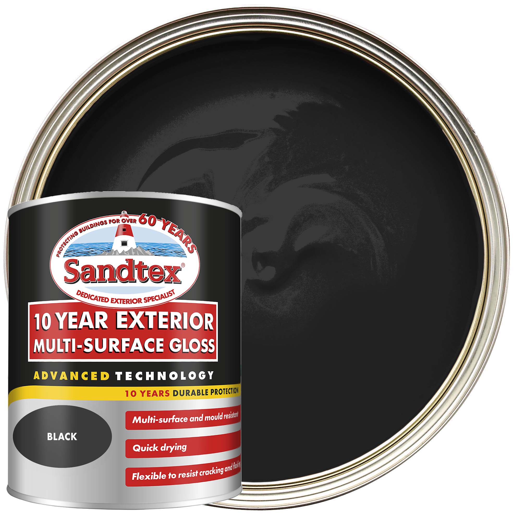 Sandtex 10 Year Multisurface Gloss - Black - 750ml - Sandtex® 10 year Exterior Multi-surface Gloss - Anthracite is specially formulated to provide up to 10 years trusted durable protection for multiple surfaces in a glossy finish. Its advanced technology is mould resistant and flexible to resist cracking and flaking.