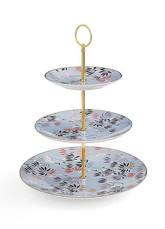Experience the delights of India with this show-stopping 3‐Tier Cake Stand from the Sara Miller London Portmeirion India Collection. Inspired by the beautiful courtyards, exotic wildlife and vibrant colours of Rajasthan, this striking sky‐blue cake stand is intricately decorated with eye‐catching cranes and Indian foliage and edged with luxurious 22 carat gold. Mix and match with other items from the stunning range for a majestic Indian afternoon tea celebration. Do not microwaveHand washFine China with 22ct goldDimensions approx. 33.3H x 27.2W x 27.2D cm