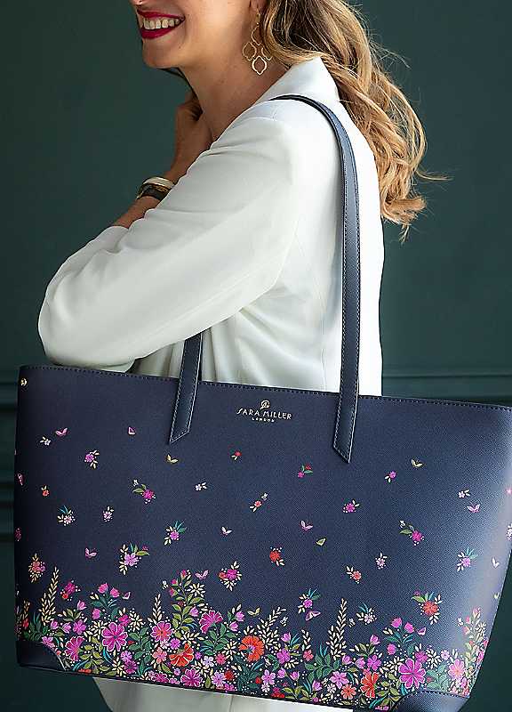 A generous-sized tote perfect for carrying all your everyday essentials whilst adding a stylish touch to any outfit. The Ditsy Floral print is a fun and colourful design with the added lustre of decorative gold foil details. Saffiano Embossed (PU) Dimensions approx. 29H, 50W, 17D cm | floral tote bag, cute tote bags, tote bags for women, saffiano purse, large tote purse, embossed purse, casual tote bag, polyurethane purse, top handle tote, tote bags with logo, navy blue tote bag