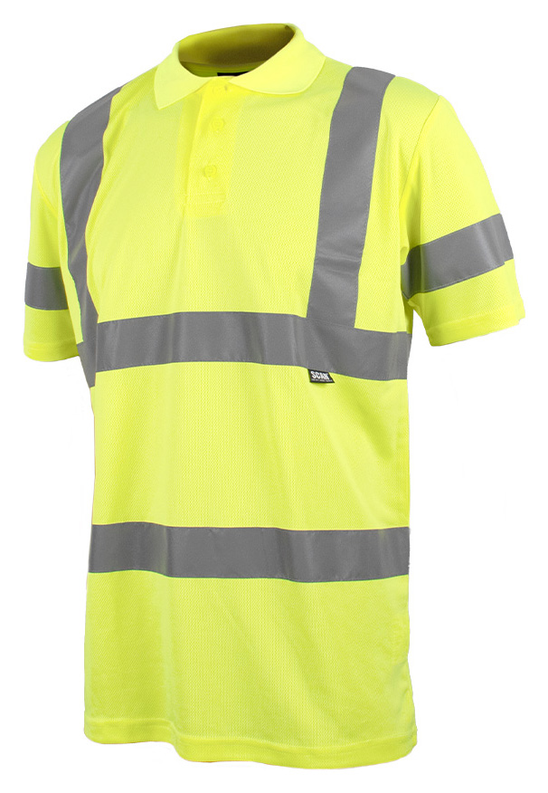 Scan Yellow Hi-Vis Polo Shirt - M - This Scan Hi-Visibility Polo Shirt conforms to EN ISO 20471 Class 2. The polo shirt has horizontal and parallel panels that reflect light to maximise visibility, particularly during the hours of darkness. Hardwearing and comfortable to wear, the open collar and short sleeve make this shirt ideal for use in warm conditions or warehouse environments where visibility is required and protection from adverse weather conditions is not necessary.