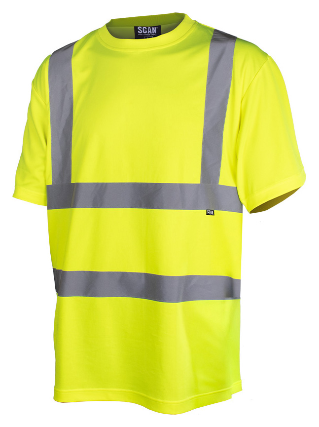 Scan Yellow Hi-Vis T-shirt - L - This Scan Hi-Visibility T-shirt meets the EN ISO 20471 Class 2 standards. It features parallel, horizontal and vertical reflective panels that enhance visibility, especially in low-light conditions. This shirt is both durable and comfortable, with a round neck collar and short sleeves, making it ideal for warm environments or indoor settings where high visibility is essential but protection from adverse weather is not required. Additionally, the garment is made from recycled materials and offers UPF 40+ protection, ensuring safety from harmful UV rays.