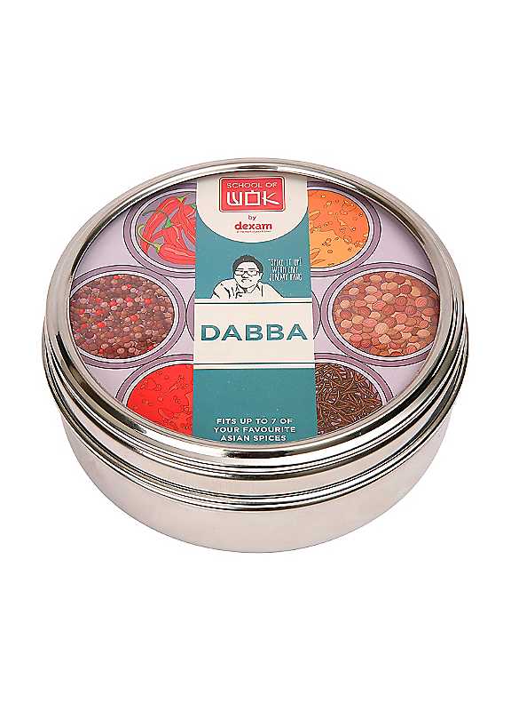 The school of wok dabba means you are never far away from your favourite spices. A stainless steel handy storage tin includes 7 spice pots and a spoon to hold your favourite Asian spices. Fill with chilli powder, whole dried chillies, Chinese 5 spice, coriander seeds, cumin seeds, sichuan peppercorns and turmeric powder to cook your favourite Asian dishes.The clear lid allows you to see exactly what spices are in the dabba and it makes a handy portable spice cupboard to take on staycations as well as a great gift for keen cooks.Stainless Steel