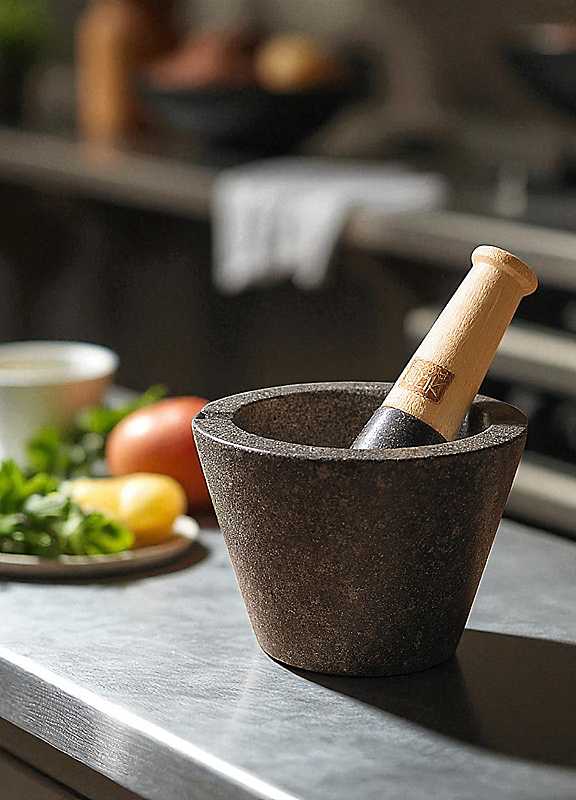 Get crushing with our granite pestle and mortar with bamboo handle. Ideal for curry pastes, whole spices, dry rubs and sauces. Designed to maximise surface contact, improving the grinding and pounding performance of herbs and spices. This pestle & mortar is hard wearing and ridged for optimal grinding of dry and wet mixes. Ideal for curry pastes, whole spices, dry rubs and sauces - the pounding and crushing gets more flavour out of the ingredients rather than the tearing and shredding of a knife or food processor.Hard wearing & ridged inside for optimal grindingEasy clean smooth exteriorLong, easy grip bamboo handlemortar includes cut-outs for pestle to rest on topHand wash onlyStoneware