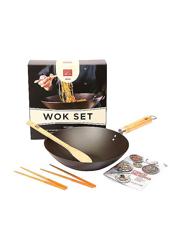 The ultimate wok set for any budding wok star, featuring our 12 cm carbon steel pre-seasoned wok. Create the best Asian dishes at home, the ultimate wok set for the budding wok star! Featuring everyone's favourite 12 carbon steel pre-seasoned wok, two sets of chopsticks, a bamboo spatula and booklet with 10 of chef Jeremy pang's best recipes from cookery book Chinese unchopped'. The pre-seasoned wok delivers outstanding performance and durability.It heats up quickly, allowing you to achieve authentic caramelised flavours, perfect for curries and stir-fries. The bamboo spatula is a great tool for protecting your wok. Then, once your food is cooked to perfection and ready to eat, enjoy sharing it using our brightly coloured chopsticks.Set of 4Two pairs of chopsticksBamboo spatulaChinese unchopped recipe bookletCarbon Steel, Bamboo