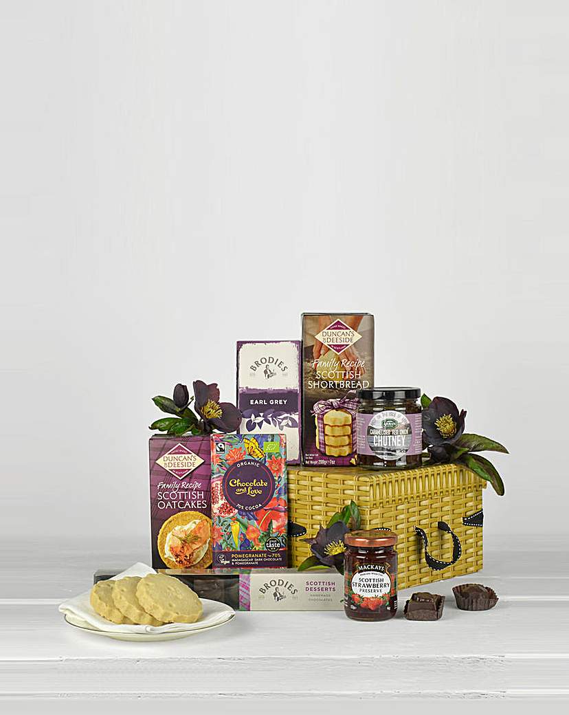 A taste of Scotland, beautifully packed. This artisan hamper, packed in a beautiful gift box, brings together classic Scottish bakes, small batch preserves and rich chocolate for a properly cosy treat. From buttery shortbread and traditional oatcakes to Earl Grey tea, chutney and handmade chocolates, its an ideal gift for birthdays, congratulations, or anyone missing Scotland. Includes: Brodies of Edinburgh Earl Grey Tea (x20). Duncans of Deeside Handbaked in Scotland Scottish Family Recipe Oatcakes (200g). Arran Fine Foods Caramelised Red Onion Chutney (195g). Mackays Scottish Strawberry Preserve (113g). Duncans of Deeside Family Recipe Scottish Shortbread (200g). Chocolate and Love Pomegranate & 70percent Madagascar Dark Chocolate Bar (80g). Brodies Unique and Award Winning Luxury Dark Chocolates with Classic Scottish Desserts flavours (100g). Presented in a Willow Basket Themed Gift Box finished with Black Ribbon. On occasion, due to stock issues, we may have to substitute some of the items. We will Always substitute to another product that is equal or greater in both value and standard.