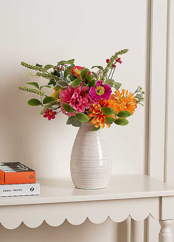 Add a vibrant touch of nature to your home with this charming artificial 45cm multi floral arrangement. Featuring a joyful mix of colourful dahlias and marigolds with lush greenery, this lifelike display captures the beauty of a freshly picked bouquet - without any of the upkeep. Expertly arranged for a full and natural look, each petal and leaf is crafted with incredible detail to mimic the real thing. Whether styled on a dining table, mantelpiece, or sideboard, this 45cm arrangement brings year-round cheer and effortless elegance to any space.Wipe clean with a soft cloth40% Fabric, 20% Plastic, 20% Ceramic, 10% Wire, 5% Foam, 5% PolyurethaneVase dimensions approx. 19.5H x 11D cm