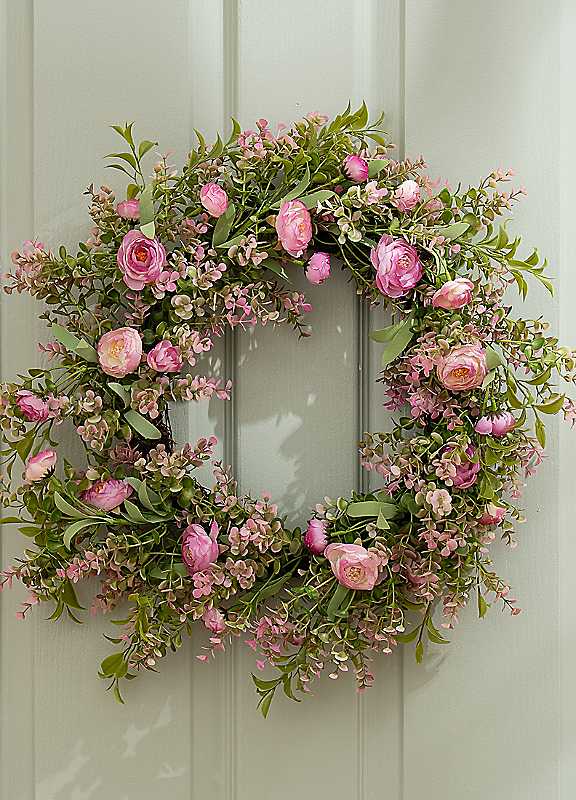 Infuse your home with the soft elegance of this stunning artificial 50cm pink ranunculus wreath. Featuring a delicate arrangement of lush, pink ranunculus blooms surrounded by rich green foliage, this wreath brings a fresh, romantic touch to any space. Ideal for hanging on doors, walls, or as a centrepiece on your table, this wreath effortlessly adds charm and beauty to your d©cor. The lifelike flowers and natural-looking leaves are carefully arranged to create a soft, feminine look that will brighten up any room - no maintenance required. Bring indoors during adverse weather conditions.Wipe clean with a soft cloth50% Plastic, 30% Fabric, 15% Wire, 5% FoamWreath width approx. 50 cm