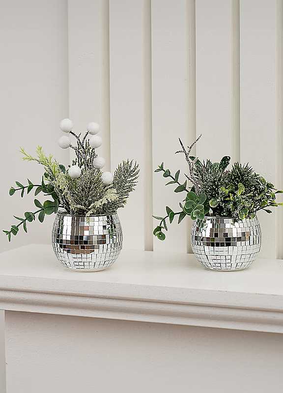 Bring a burst of sparkle and style to your holiday d©cor with this set of 2 artificial Christmas mirrorball pots with plants. Each piece pairs lush, lifelike greenery with a dazzling mirrorball-inspired pot that reflects the light beautifully, creating a festive glow that instantly brightens any space.Perfect for modern holiday styling, these eye-catching accents are ideal for mantels, shelves, side tables, or even as party-ready centrepieces. No watering, no wilting - just lasting holiday cheer wrapped in glam.From cosy nights in to Christmas parties with a twist, these shimmering mini plants bring the joy, the style, and all the festive feels - no green thumb required.Vase: 40% Glass, Plant: 40% Plastic. 5% Polyfoam, 5% StoneDimensions approx. 7.8 x 7.5 x 7.5 cm, Each pot size approx. 7.5D x 6.5H cm