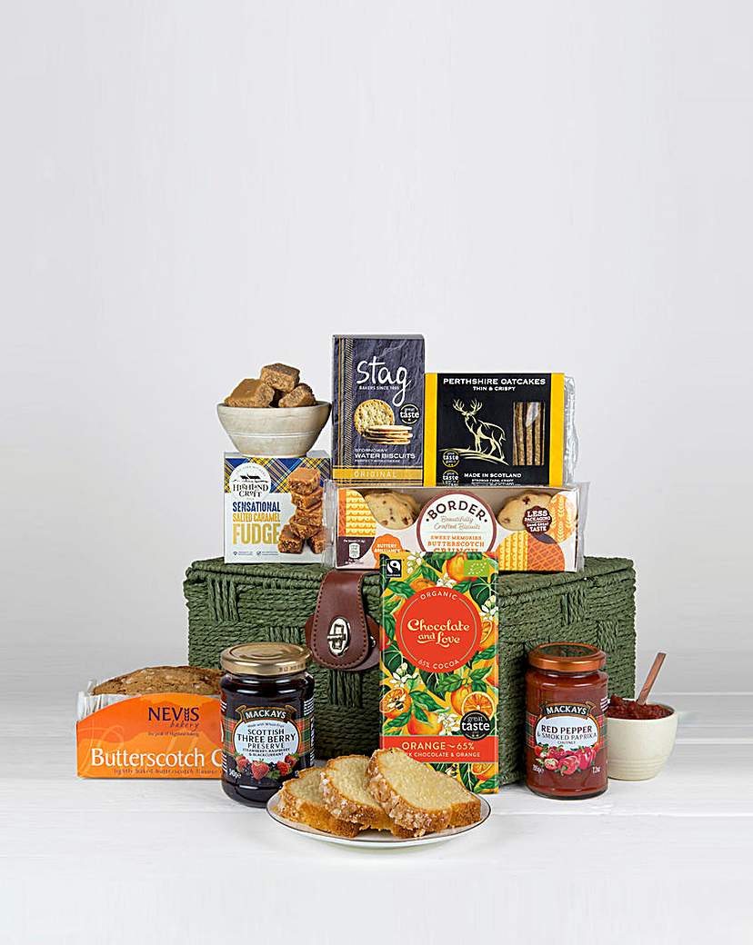 A generous Scottish inspired hamper packed with bakery favourites, classic preserves, and a touch of luxury chocolate. From buttery biscuits and traditional oatcakes to rich salted caramel fudge and two award winning Mackays jars, its a brilliant all rounder for birthdays, thank yous, housewarmings or anyone who loves a good cuppa and a well stocked snack tin. Includes: Duncans of Deeside Hand baked in Scotland Scottish Cheese Oatcakes (200g). Stag Bakers Original Water Biscuits (150g). Mackays Red Pepper & Smoked Paprika Chutney (205g). Nevis Butterscotch Cake (360g). Mackays Scottish Three Berry Preserve (340g). Border Biscuits Butterscotch Crunch (135g). Stewarts of Scotland Salted Caramel Fudge presented in a Box (125g). Chocolate and Love 65percent Cocoa Organic Dark Chocolate Bar with Orange Extract (80g). Presented in a Green Paper Rope Hamper with Brown Faux Leather Strap. On occasion, due to stock issues, we may have to substitute some of the items. We will Always substitute to another product that is equal or greater in both value and standard.