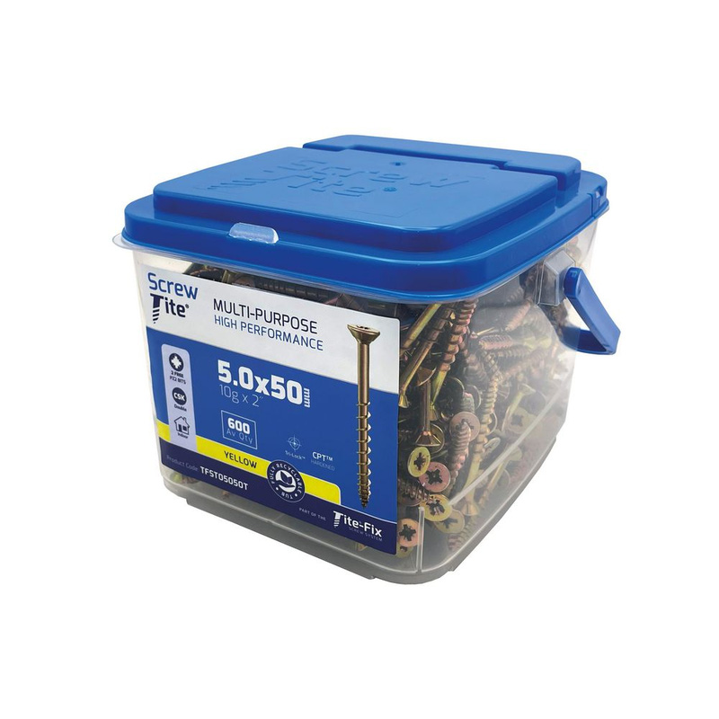 Perfect for use in timbers, boards, hard and softwood Can also be used for sheet steel, plastic, masonry (pilot hole required) and more Tri-Lock shank - 25% less insertion torque and no timber damage Firm and secure fit - once driven in, it stays in Excellent close-to-edge driving performance For ease of use and all-round performance, this tub of Screw-Tite wood screws takes some beating. They're designed with an innovative Tri-Lock shank and thread - this cleverly combines the benefits of a single and twin thread on the same screw. With 25% less insertion torque, you'll get a faster fit that eases the strain on your power tool and helps to extend battery life. It won't damage the timber, and ensures a strong and secure fixing - once you've driven it in, the Screw-Tite stays in!* Wood screws - perfect for timber, board, hard and soft wood* Versatile - use on sheet steel, plastic or masonry (pilot hole required)* Tri-Lock shank - 25% less insertion torque and no timber damage* Pozidriv - countersunk screws with PZ head for reduced cam-out* Precision work - excellent close-to-edge driving performance* Efficient - fast insertion places less strain on power tool batteries* Firm and secure fit - once driven in, a Screw-Tite stays in | Screw-Tite Pozi Countersunk Screw 5.0 x 50mm (600tub) in Yellow | Steel