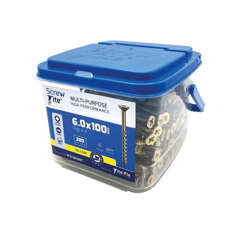 Perfect for use in timbers, boards, hard and softwood Can also be used for sheet steel, plastic, masonry (pilot hole required) and more Tri-Lock shank - 25% less insertion torque and no timber damage Firm and secure fit - once driven in, it stays in Excellent close-to-edge driving performance For ease of use and all-round performance, this tub of Screw-Tite wood screws takes some beating. They're designed with an innovative Tri-Lock shank and thread - this cleverly combines the benefits of a single and twin thread on the same screw. With 25% less insertion torque, you'll get a faster fit that eases the strain on your power tool and helps to extend battery life. It won't damage the timber, and ensures a strong and secure fixing - once you've driven it in, the Screw-Tite stays in!* Wood screws - perfect for timber, board, hard and soft wood* Versatile - use on sheet steel, plastic or masonry (pilot hole required)* Tri-Lock shank - 25% less insertion torque and no timber damage* Pozidriv - countersunk screws with PZ head for reduced cam-out* Precision work - excellent close-to-edge driving performance* Efficient - fast insertion places less strain on power tool batteries* Firm and secure fit - once driven in, a Screw-Tite stays in | Screw-Tite Pozi Countersunk Screw 6.0 x 100mm (200tub) in Gold | Steel