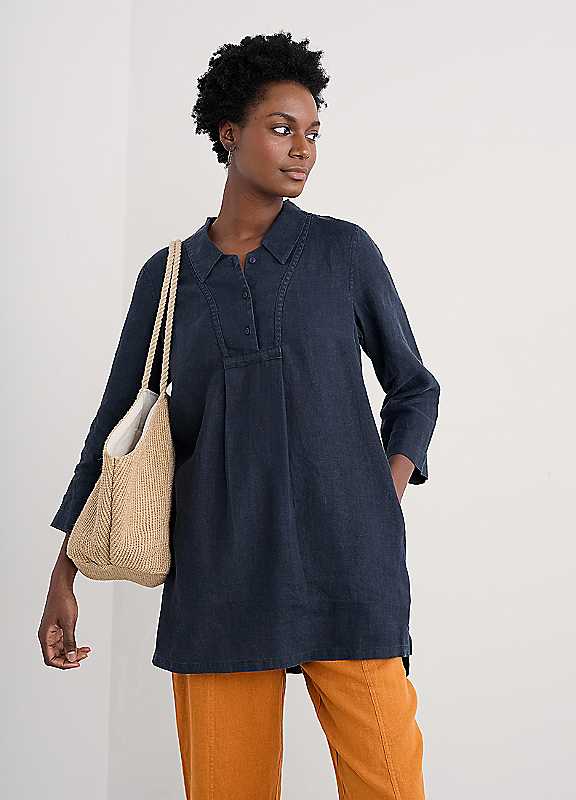 A long tunic with a classic collar, inspired by artist's smocks. Box pleats give an easy volume. The perfect trans seasonal layer.Machine washable100% Linen