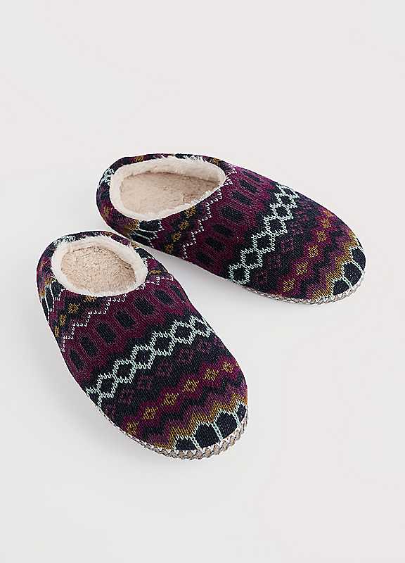 Cosy slippers with a heritage Fair Isle stitch and a soft faux fur lining, perfect for walking on cold tiles and wood floors.Upper: 45% Recycled Nylon, 30% Cotton (Organic), 25% Merino Wool