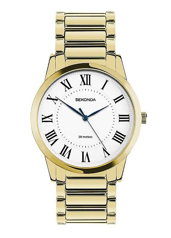 This watch has a gold round 40mm alloy case, housing a semi-matte white dial featuring roman dials and blue hands. The watch is fastened with a gold alloy bracelet with a folding clasp.BLUE HANDS - This stunning men's watch has an easy to read white dial with classic roman numeral hour markings. What makes this watch truly special is the deep blue second, minute and hour hands. Perfect for adding some fun to your wrist.MOVEMENT - This watch houses a Japanese movement that offers optimized precision, power saving and freedom of design.GUARANTEE - Your Sekonda watch comes with a standard 2 year guarantee.Water resistant up to 50 metresComes with a 2 year guaranteeThis watch uses 1 x SR626SW for it's replacement battery | men's analog wrist watch, roman numeral watches, mens bracelet watch, classic watches for men, water resistant watches, gold watches for men, casual watches for men, round watches for men, quartz watches for men