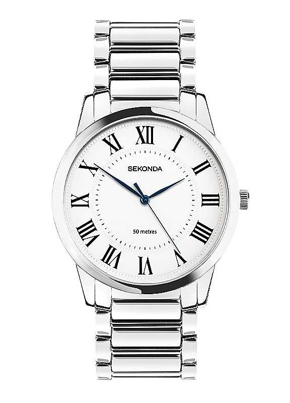 This watch has a silver round 40mm alloy case, housing a semi-matte white dial featuring roman dials and blue hands. The watch is fastened with a silver alloy bracelet with a folding clasp.BLUE HANDS - This stunning men's watch has an easy to read white dial with classic roman numeral hour markings. What makes this watch truly special is the deep blue second, minute and hour hands. Perfect for adding some fun to your wrist.MOVEMENT - This watch houses a Japanese movement that offers optimized precision, power saving and freedom of design.GUARANTEE - Your Sekonda watch comes with a standard 2 year guarantee.Water resistant up to 50 metresComes with a 2 year guaranteeThis watch uses 1 x SR626SW for it's replacement battery