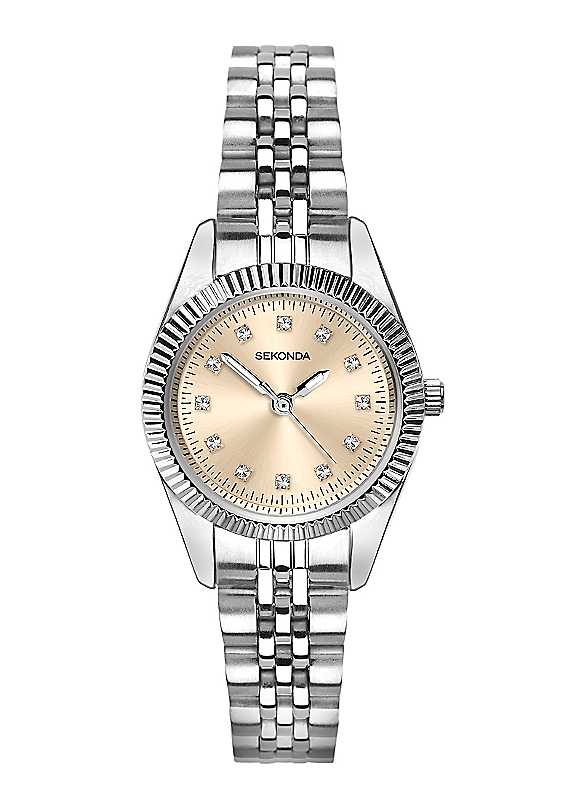 This watch fastens with a silver stainless steel bracelet. The watch has a round silver coloured case housing a rose, stone set sunray dial.SIMPLE LUXURY - The Francis is the perfect example of simple luxury with a classic design and coin-edged case. Perfect for everyday wear and dressing up any outfit.MOVEMENT - This watch houses a Japanese movement that offers optimized precision, power saving and freedom of design.GUARANTEE - Your Sekonda watch comes with a standard 2 year guarantee.