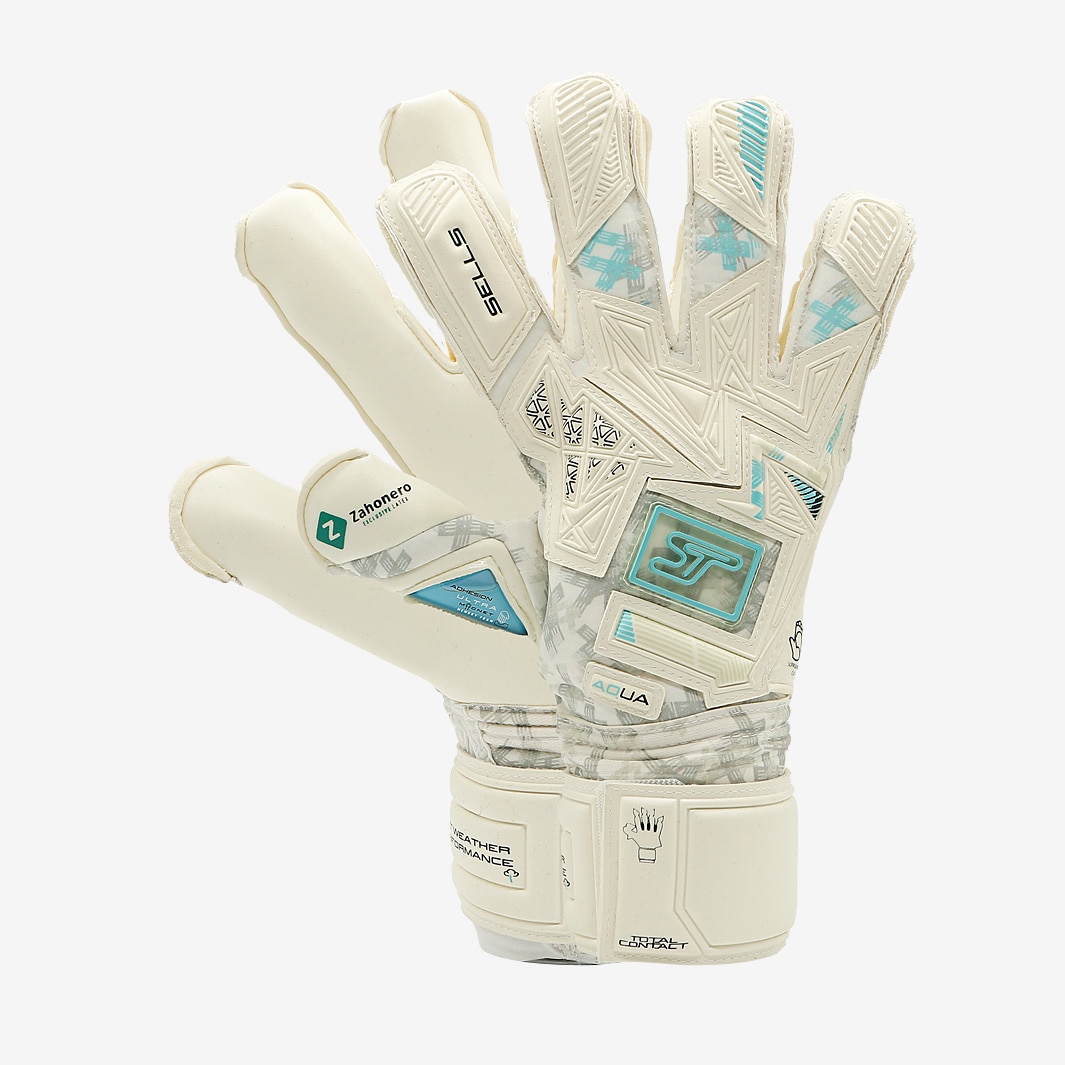 Perform at your best in wet conditions wearing Sells Kids Total Contact Aqua Pure goalkeeper gloves in WhiteAqua Blue, featuring Adhesion Ultra latex for nextlevel grip in the rain. Designed to give you complete confidence in your catching and handling, the Pure edition of the Sells Total Contact Aqua is equipped with their reliable wetweather latex formula to make sure the ball stays under your control, even during a downpour. The Adhesion Ultra palm is backed with memory foam for instant shock absorption, taking the sting out of shots and allowing greater control as you push goalbound efforts away to safety. The gloves everpopular Expanse cut combines the best elements of rollfinger, negative, and classic cuts, surrounding the hand at all axis points and following its natural shape for comfort and flexibility. To further increase ball contact and improve grip, the latex extends around the outside of the hand on the pinkie side. On the backhand, new Ordway Outlast material provides thermoregulation and moisture reduction to keep your hands dry and fresh, while remaining strong, soft, and comfortable. CUT Expanse cut with Surround cut PALM 3.5mm Adhesion Ultra Magnet latex with 5mm Memory Foam BACKHAND Outlast Ordway 3mm latex WRIST CLOSURE Acclimatize fabric with elastane insert and ACZ Adhesion Control Zone strip latex strap with stretch insert