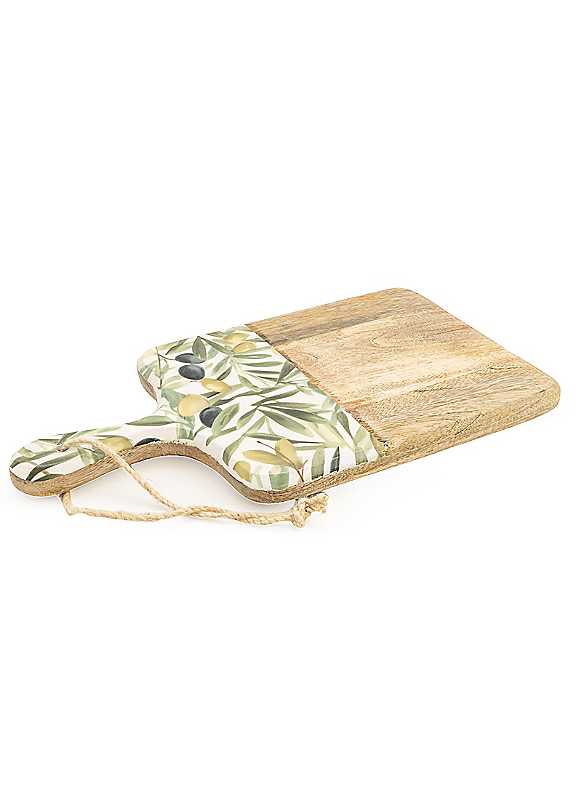 Serve in style with this handcrafted serving paddle board, meticulously crafted from mango wood and adorned with a tasteful olives motif. The board's sturdy construction makes it perfect for slicing bread, chopping vegetables, or presenting a selection of cheeses and cured meats. The olive design adds a touch of Mediterranean charm, ideal for those who enjoy a rustic yet sophisticated aesthetic in their kitchenware. 100% Mango Wood Dimensions approx. 2.5D x 27W x 32H cm Not suitable for dishwasher or microwave use. Do NOT hand wash, Wipe clean only. This is a hand crafted item and some variation may occur.
