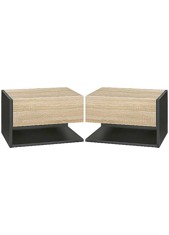 A sleek blend of modern style and practical design, this floating bedside table set saves space while elevating the look and feel of your room. Upgrade your bedroom d©cor with this set of two bedside tables, featuring a sleek black and oak wood finish. Their minimalist look adds a touch of modern sophistication to any bedroom or guest room. These leg-free bedside tables can be installed at your preferred height, creating a clean, floating appearance. The design makes floor cleaning easier and protects your belongings from moisture by keeping them off the ground. Each table features one drawer and one open shelf, providing space for night-time essentials like books, glasses, or electronics - plus a top surface for a lamp or d©cor. Made from sturdy particle board with a laminate black-and-oak finish, each table supports up to 8 kg and is built to last.Set Includes: 2 bedside tablesLoad Capacity: 8 kg (each)Assembly: RequiredOverall dimensions approx. 46W x 30D x 30H cm (each)