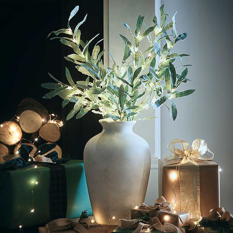 This set of 3 olive branches will look stunning in any vase or floral decoration this Christmas. Simply stand in your own vase on a mantle or windowsill to brighten up the area.Set of 3Warm white mini-LEDs per branchRequires 3xAA batteries (not included)Size approx. 3 x 20 cm