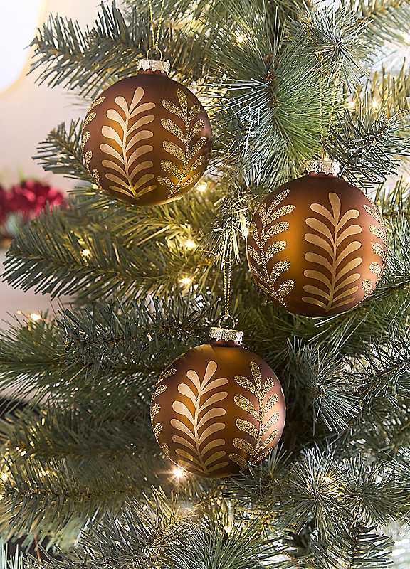 Crafted from glass, and adorned with a stunning golden leaf pattern, these baubles rich hues exude warmth and sophistication, making it an irresistible purchase.Set of 3Glass baublesIndoor use onlySize approx. 15H x 13W cm