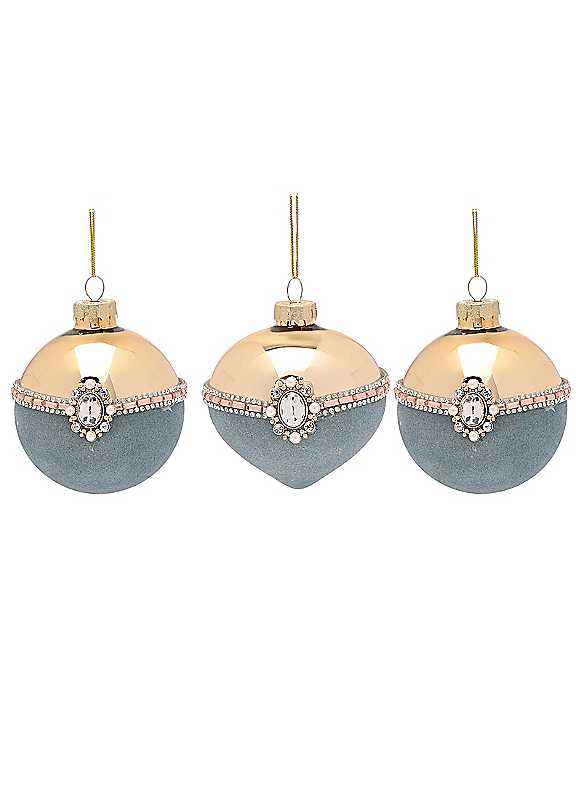 Discover the elegance of our Set of 3 Ornate Blue & Gold Hanging Decorations. With their intricate designs and rich colours, they are a timeless addition to any festive display. Each glass decoration features a unique jewelled embellishment, in shades of blue and gold.Set of 3Glass baublesIndoor use onlySize approx. 15.5H x 9.5W cm