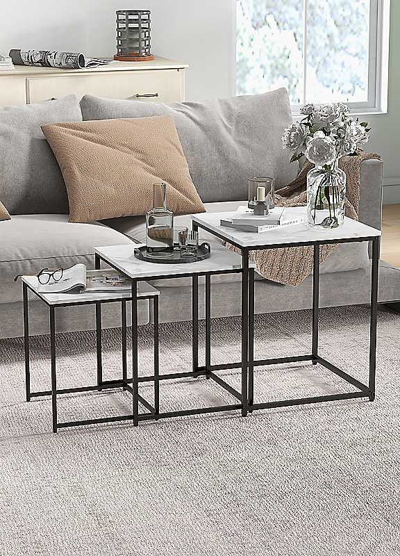 Elevate your home or office with this elegant set of three nesting tables. Perfectly sized to be used together or separately, these versatile tables add a touch of modern sophistication wherever you place them.Weight capacity: 5 kg per tableAssembly RequiredThree sizes included: Small, medium, and large tables nest together neatly or can be positioned independently to suit your spaceStrong steel bases: Powder-coated steel frames provide a sturdy and supportive core, with adjustable feet to ensure stability on uneven floorsStylish marble-effect tabletops: Smooth melamine-coated surfaces offer a sleek, elegant look with easy cleaning and durable protectionVersatile use: Ideal as bedside tables, sofa side tables, or general end tables throughout your home or officeCompact & practical: Nesting design saves space when tables are not in useParticle Board, SteelLarge table dimensions approx. 60H x 50W x 50L cmMedium table dimensions approx. 56.5H x 45W x 45L cmSmall table dimensions approx. 48.5H x 39.5W x 39.5L cmPlease remember to measure your available space before ordering. If using on an un-carpeted floor we recommend rubber or felt protection pads be used under the legs to avoid damage to your floors.