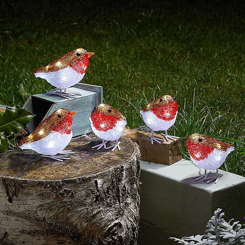 Bring the magic of Christmas to your home and garden with this set of 5 festive inlet Robin ornaments.Set of 540 cool white LEDsSuitable for outdoor & indoor useAuto timerBattery poweredDimensions approx. H11.5 x W6 x D11 cm