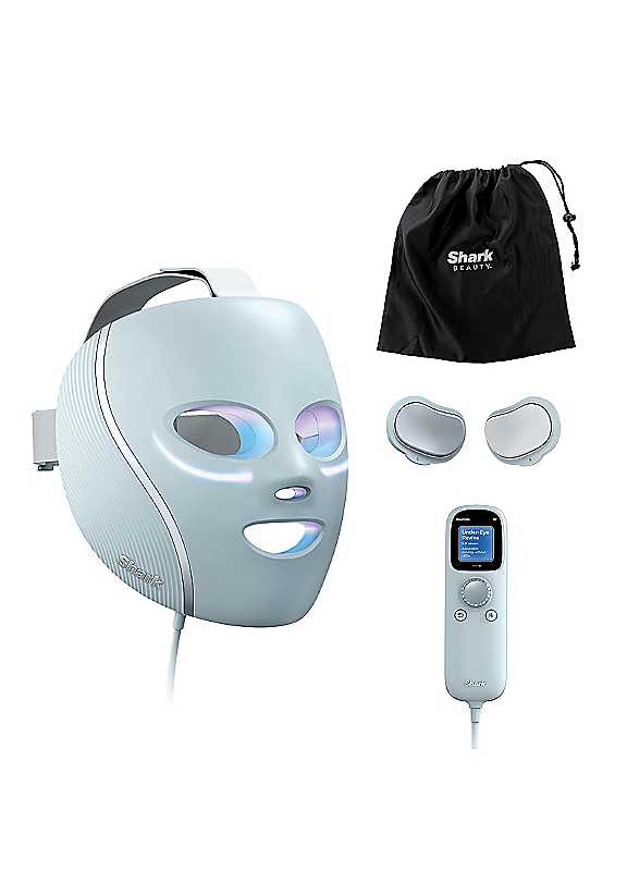 Every skin type. Any skin tone. The future of skincare.Introducing Shark CryoGlow, the UK's first LED light therapy mask to offer under-eye cooling technology. Under-eye cooling helps soothe, depuff and tighten under-eyes. LED routines help reduce the appearance of fine lines and wrinkles over time, and helps reduce the appearance of textured, uneven skin and blemishes. Developed with Dermatologists.4 effective modes:- Under-Eye Cooling- Powered by InstaChill Cold Technology: Two active points of cooling help firm, tighten, soothe and depuff under-eyes.- Use under-eye cooling with any LED routine (Better Ageing, Blemish Repair or Skin Sustain) and cycle through 3 temperatures.- Or use Under-Eye Revive Mode, an adjustable 5, 10 or 15-minute under-eye cooling routine (no LEDs) for a soothing and refreshing experience designed for optimal relaxation.Better Ageing (6 minutes)- Red LEDs + Infrared combined.- Helps reduce the appearance of fine lines and wrinkles over time.Blemish Repair (8 minutes)- An automated 3-phase routine combining Blue LEDs + Infrared, finishing with Red LEDs.- Helps reduce the appearance of textured, uneven skin and blemishes for smooth, glowing skin with an automated 3-phase routine.Skin Sustain (4 minutes)- Blue/Red LEDs + Infrared combined.- Designed to boost brightness and maintain results after an 8-week cycle of Better Ageing or Blemish Repair mode.The remote keeps track of your sessions to help you meet your skin goals. You can easily view your cumulative progress across routines, the total number of sessions you have completed and how many sessions you have completed in a row, to easily keep track of your progress.2-year guarantee (upon registration with Shark, UK & ROI only).Brand: SharkUniversal-size LED Face Mask with 4 modes for powerful skin results on any skin typeUnder-Eye Cooling: Helps soothe and depuff under-eyes with Insta-Chill Cold TechnologyBetter Ageing Mode: Helps reduce the appearance of fine lines and wrinkles over timeBlemish Repair Mode: Helps reduce the appearance of textured, uneven skin and blemishesSkin Sustain Mode: Designed to boost brightness and maintain results after an 8-week cycle of Better Ageing or Blemish Repair modeRed & Blue LEDs + Infrared Technology for powerful skin results, at homeColour: Blue FrostIncludes Light Therapy Mask with Adjustable Straps, LED Protective Cover, Silicone Eye Shields, Remote Control with LCD Screen, USB-C Charging Cable & User GuideDimensions approx. L203 x W139.7 x H218.8 cm